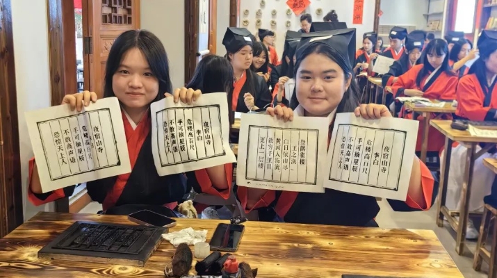 在河口古鎮(zhèn)的國學(xué)活字印刷研學(xué)館,港澳青少年們親自動(dòng)手體驗(yàn)了古代的活字印刷術(shù)。他們小心翼翼地?cái)[放著字模,用墨汁輕輕刷過,再將宣紙覆蓋其上,輕輕一壓,一幅幅唐詩便躍然紙上。他們齊聲用粵語朗誦了“憫農(nóng)”“春曉”“相思”等經(jīng)典唐詩,不僅領(lǐng)略了民間藝術(shù)的獨(dú)特魅力,更在實(shí)踐中感受到了中華文化的博大精深。