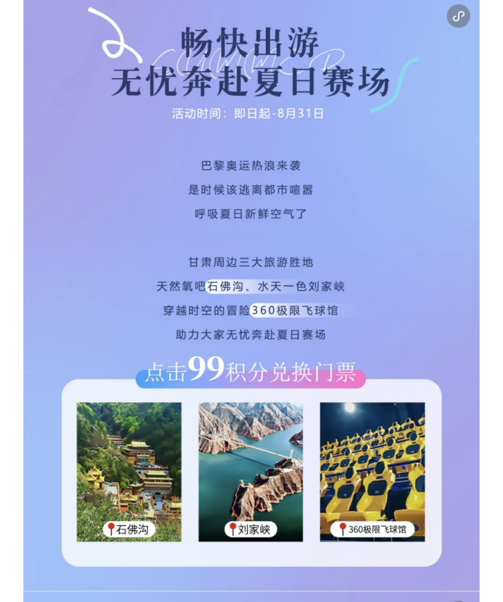 首期活動,運營集團(tuán)精選蘭州石佛溝國家森林公園(國家AAAA級旅游景區(qū))、劉家峽恐龍國家地質(zhì)公園(國家AAAA級旅游景區(qū))及蘭山360極限飛球三家景區(qū)場館參與活動。期間,吾悅廣場室內(nèi)外大屏也將滾動播放景區(qū)場館的宣傳影片,供廣大消費者了解景區(qū)場館詳細(xì)信息。后續(xù),運營集團(tuán)將根據(jù)市場反饋與實際情況,不斷調(diào)整、更新活動場館,為廣大消費者帶來更加豐富多元、新鮮有趣的旅游體驗。