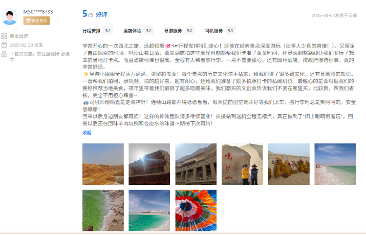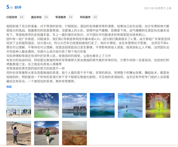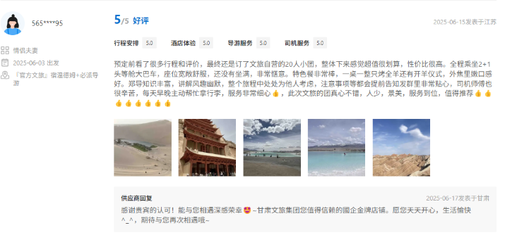 文旅國旅深度整合甘青兩地的經(jīng)典與小眾旅游資源,精心打造、上線行程豐富、體驗舒適產(chǎn)品的同時南京運營中心緊密圍繞游客核心需求,協(xié)同配備金牌工作人員隨團提供專業(yè)講解與服務(wù),獲得廣泛好評。平臺數(shù)據(jù)顯示,近半年以來,其攜程店鋪訂單量同比增長超過40%,訂單完成率高達98.5%,展現(xiàn)出高度的市場認可與出色的運營效能。用戶口碑方面,店鋪好評率持續(xù)穩(wěn)步提升,目前已達4.9分,累計精選好評超千條,“質(zhì)量可信、服務(wù)可依”的品牌形象日益凸顯。