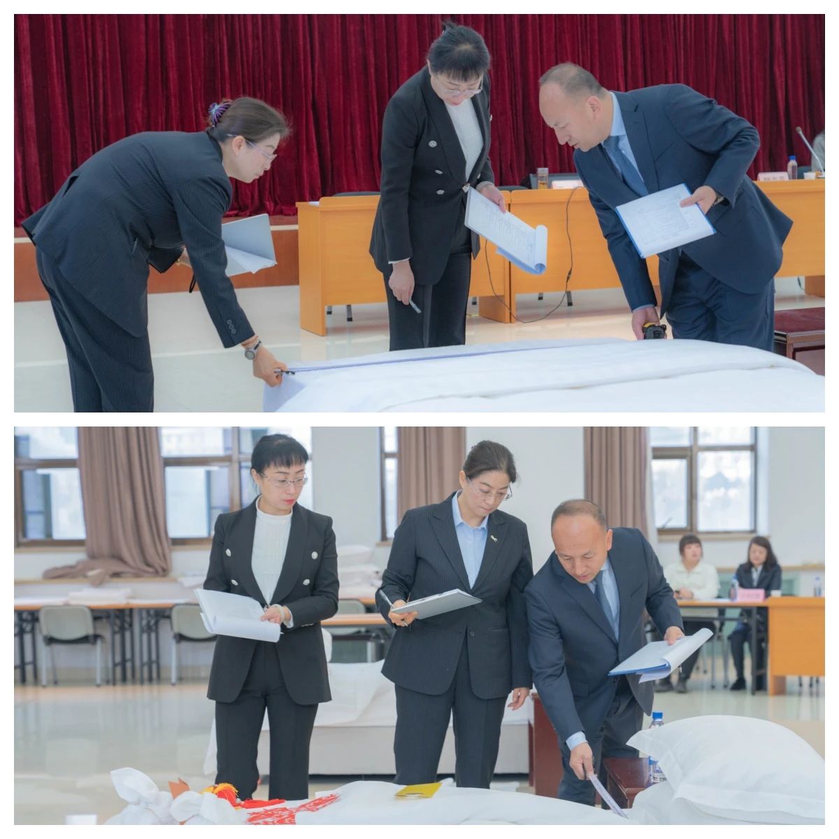 評委們認真檢查選手做床完成情況,從鋪床準備、操作規(guī)范等方面進行綜合評判。
